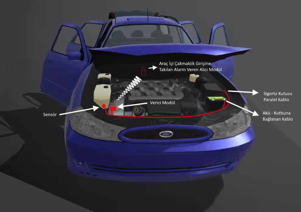 Cevap: Sistemin besleme kablosu, aracı çalıştırdıktan sonra enerjilenen bir kablo olacağı için boştayken güç çekmiyor diyebiliriz. Araba çalışıyorken alarm çalmadığı zamanlarda ise ufacık bir güç tüketmekte 5mA. güç çekmektedir. Alarm zaten her zaman çalmayacak, çaldığı sırada ise buzzer gücüne göre 20mA ila 50mA arasında bir akım çekebilecektir.