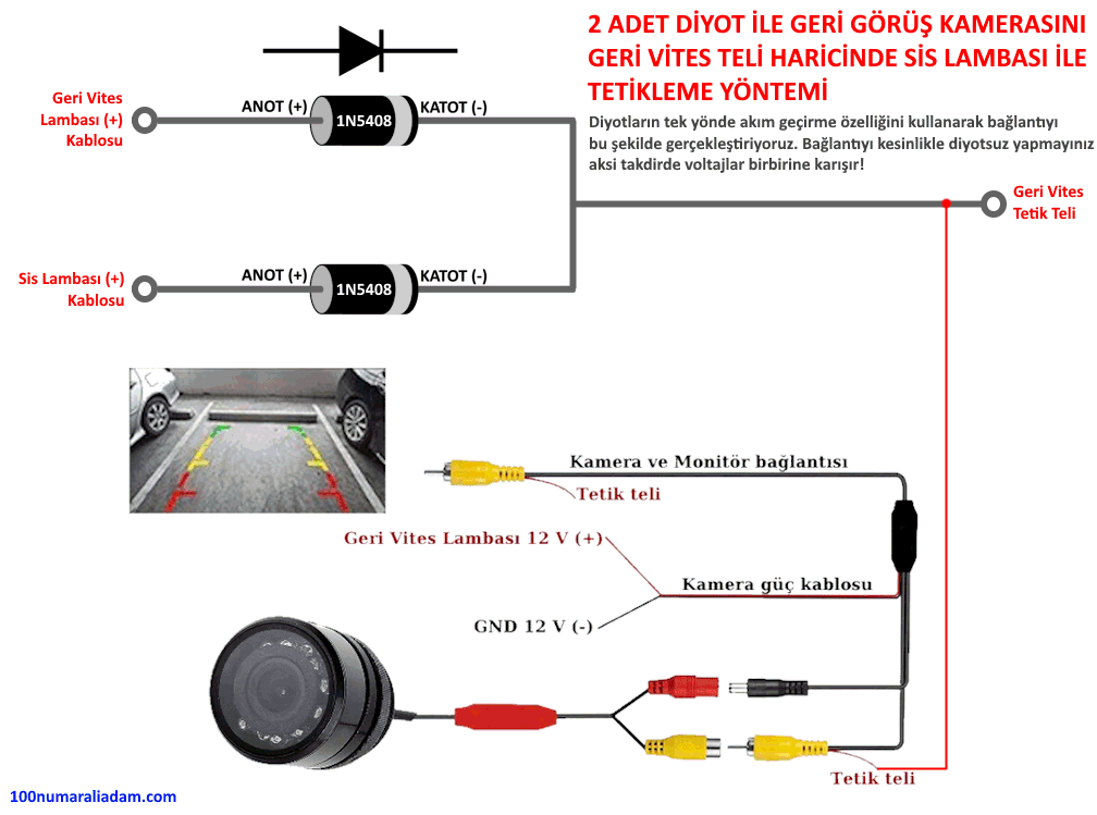 Yukarıdaki bağlantıyı yaparken takılacağınız tek nokta belki de diyotun yönü olacaktır. Şemada net görünse de şunu yapabilirsiniz: Diyotu bağladığınızda sistem çalışıyorsa doğru bağlamışsınızdır 🙂 ters bağladığınızda zaten 12 voltu keseceği için çalışmayacaktır yani deneyerek yapabilirsiniz. Örneğin geri vitese diyotlu kabloyu bağladınız ve aracı geri vitese aldınız kamera çalışıyorsa doğru bağladınız demektir. Sonrasında sis lambasında da aynı şekilde bağlayıp sis lambasını yaktığınızda çalışıyor mu diye bakabilirsiniz.